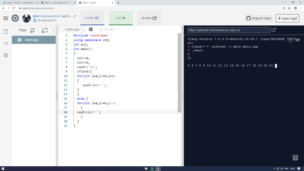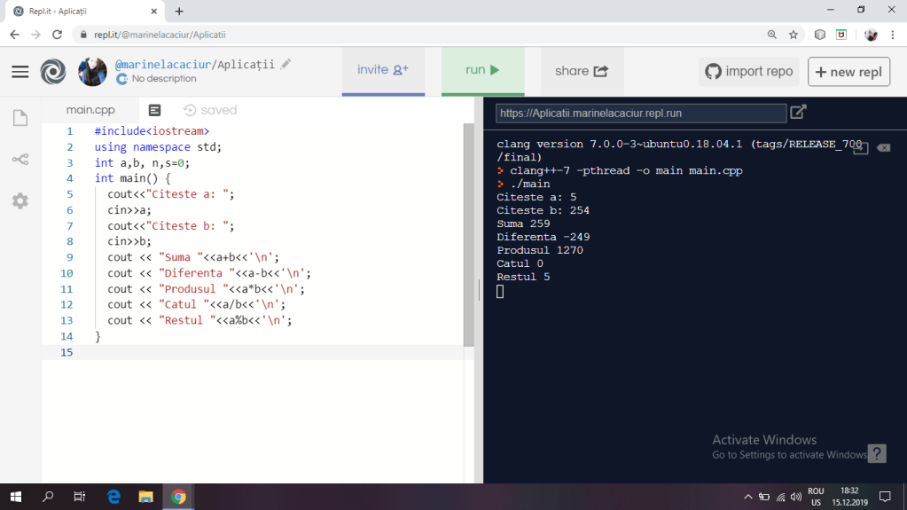 - Se citesc de la tastatură două numere naturale a și b. Scrieți un program C++ care afișează suma, diferența, produsul, câtul, restul celor două numere.