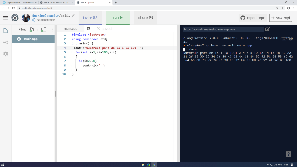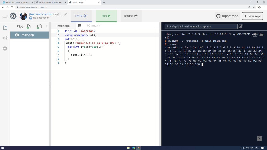 5. Să se contruiască un program C++ care afișează toate numerele de la 1 la 100.